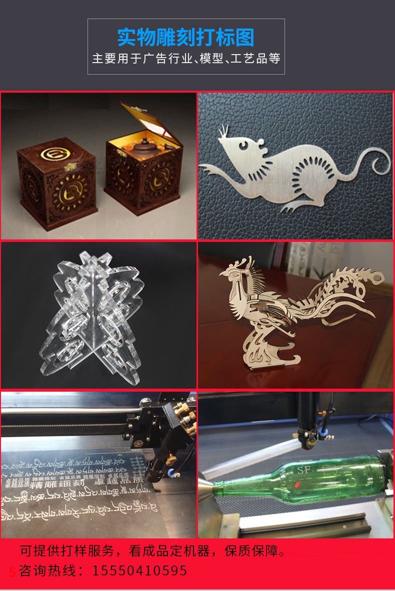 1290A型激光切割机适用行业:广告,工艺品,皮革,玩具,服装,模型,建筑装潢,电脑绣花裁剪,包装业和纸业。